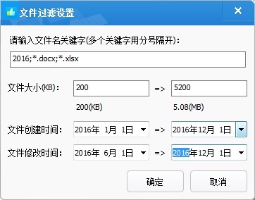 输入文件名关键字,多个关键字用“;”隔开。比如,我设置的就是找到所有文件名字包含2016的docx、xlsx文件。